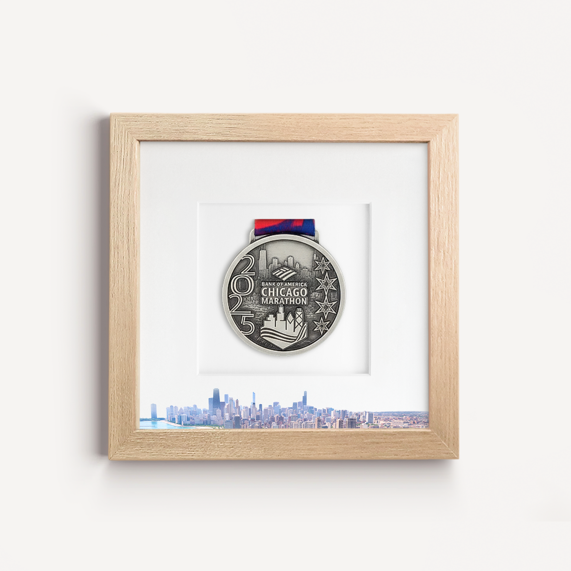 Featuring the powerful Chicago city skyline, this frame is designed to showcase medals and bibs from any race or endurance event held in this region, across any year. Because your medal and bib already carry official event branding, the frame remains timeless - whether you raced recently or years ago.