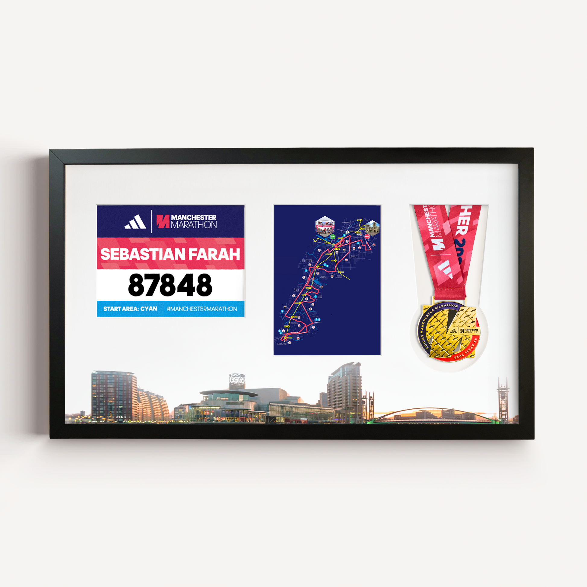 The perfect medal display frame for athletes who have competed in the Adidas Manchester Marathon, as well as other major Manchester-based events such as AJ Bell Great Manchester Run and The Ultra Loop, Manchester.